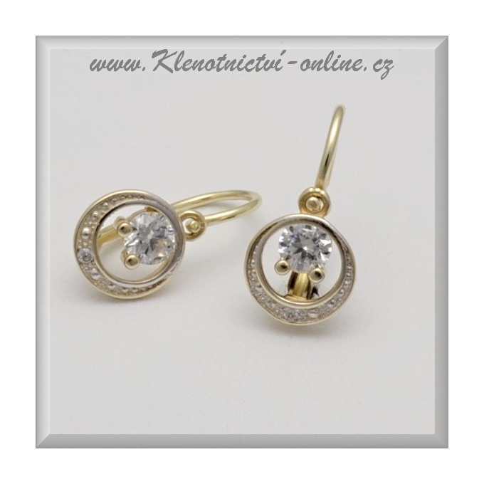 Zlaté dětské náušnice ve tvaru kruhu, které zdobí hned dva zirkony. Jeden velký bílý a druhý menší taktéž bílý, který je zasazen ve spodní části náušnic. Náušnice ze žlutého čtrnáctikarátového zlata. Zapínání dětské na patent. Česká výroba. Nejširší část náušnic měří 8 mm, výška náušnic 14 mm. Váha: 1,39g, ryzost 585/000.