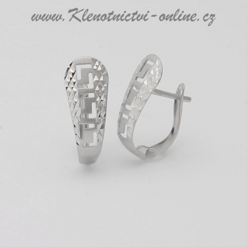 Náušnice z bílého čtrnáctikarátového zlata. Atraktivní náušnice zdobené prořezávaným vzorem a jemnou rytinou.