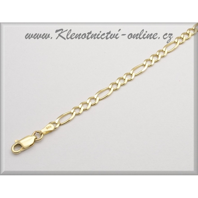 Zlatý pánský náramek, vzor figaro, ze žlutého čtrnáctikarátového zlata. Náramek tvoří tři malé očka a jedno větší. Náramek je po strannách broušený. Jedná se o oblíbený vzor pánského náramku, doporučujeme. Zapínání na karabinu. Vlastnosti náramku: délka náramku 21 cm, šířka náramku 4 mm, váha 5,55g, ryzost 585/1000.